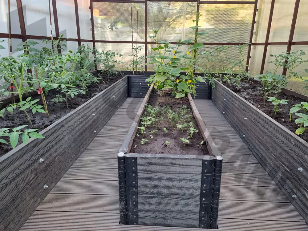 Стремилась создать комфортную аккуратную среду для урожая. Не знала, где купить теплицу. Купила по рекомендации в журнале. Слышала также про грядки ДПК в теплице, они теплые и дают хороший урожай. Уже заказав грядки из ДПК, подумала, что и пол необходимо сделать, быстро оформила дозаказ на террасные доски и теперь любуюсь результатом.